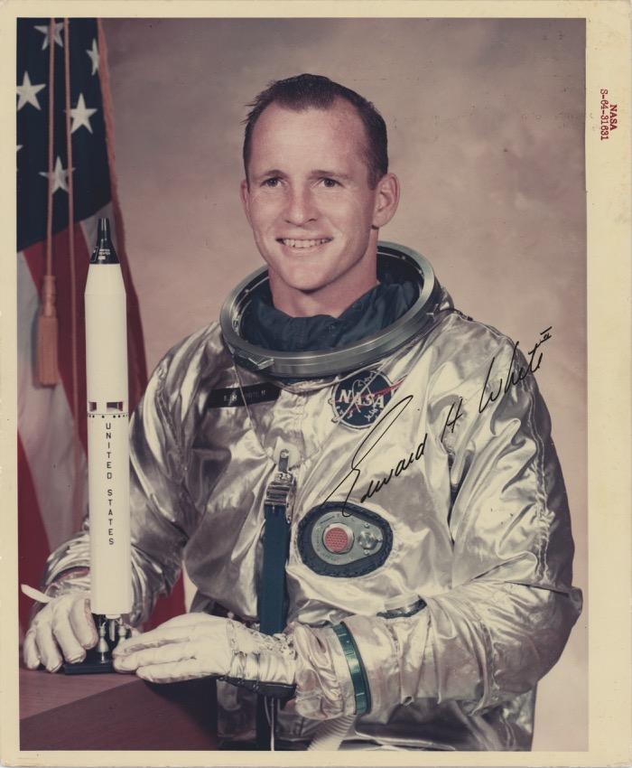 to Edward H. White II for outstanding contributions to space flight and engineering. His performance, as Pilot, during the four-day Gemini Mission and as the first man to engage in self-propelled extravehicular activity significantly extended our knowledge of the space environment and man’s capabilities in space flight.” Signed in fountain pen by NASA Administrator James E. Webb, and countersigned by Deputy Administrator Hugh Latimer Dryden. Framed to an overall size of 15.25 x 12.25. In fine condition. Accompanied by two original NASA press photos of the presentation ceremony, and a letter of provenance from White’s son, in part: “This Exceptional Service Medal Citation was presented to my father by President Lyndon B. Johnson on June 11, 1965, in a ceremony at the White House. I was in attendance at the ceremony and witnessed the presentation.” Starting Bid $200