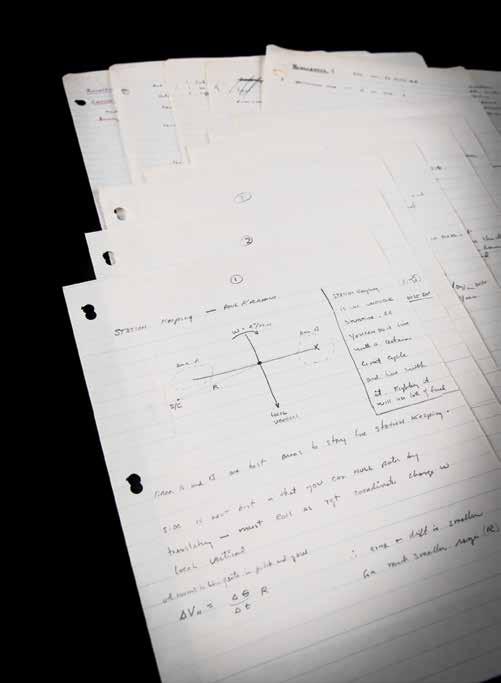 The first topic, which lists MSC Branch Chief Paul Kramer (Crew Safety and Procedures), states on the first page: “Station Keeping is an unstable situation. All you can do is live with a certain limit cycle and live with it. Fighting it will use lots of fuel.” The balance of this section contains myriad equations and axes and/ or coordinate planes, with the fourth page starting a “Rules for Station Keeping” list, which reads, in part: “1. Seek a position Line of site horizontal & in (behind or ahead) or normal (to side) to target orbital plane. 2. Separate in plane & out of plane maneuvers with priority to in plane (in plane is divergent – out of plane is cyclic).”