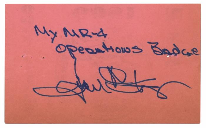 SALE OF AUTOGRAPHED COLLECTIBLES: AS REQUIRED BY LAW, A DEALER WHO SELLS TO A CONSUMER ANY COLLECTIBLE DESCRIBED AS BEING AUTOGRAPHED MUST PROVIDE A WRITTEN EXPRESS WARRANTY AT THE TIME OF SALE. THIS DEALER MAY BE SURETY BONDED OR OTHERWISE INSURED TO ENSURE THE AUTHENTICITY OF ANY AUTOGRAPHED COLLECTIBLE SOLD BY THIS DEALER.
