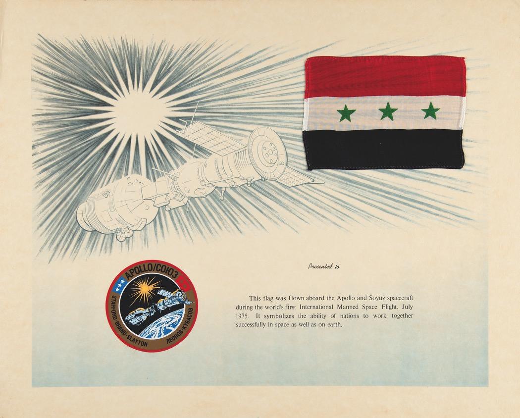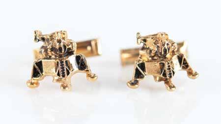 Other unflown charms include: an enameled NASA ‘meatball’ logo charm; a shield-shaped “Apollo” charm; an enameled “Apollo” moonwalker charm; an “Apollo 11 / First Lunar Landing” charm; and a small silver-tone sculptural charm portraying three Apollo astronauts. The bracelet’s clasp is marked “Sterling.” In overall fine condition.