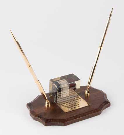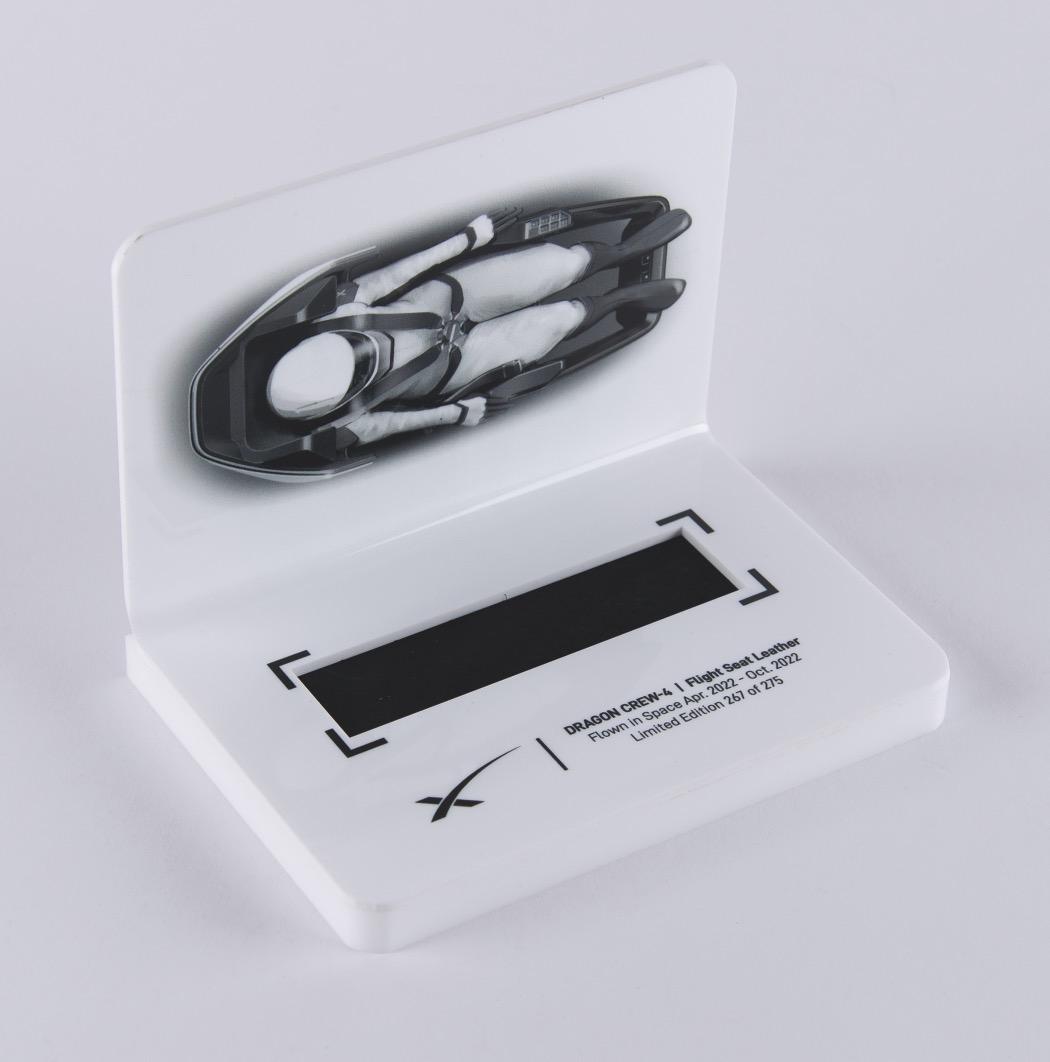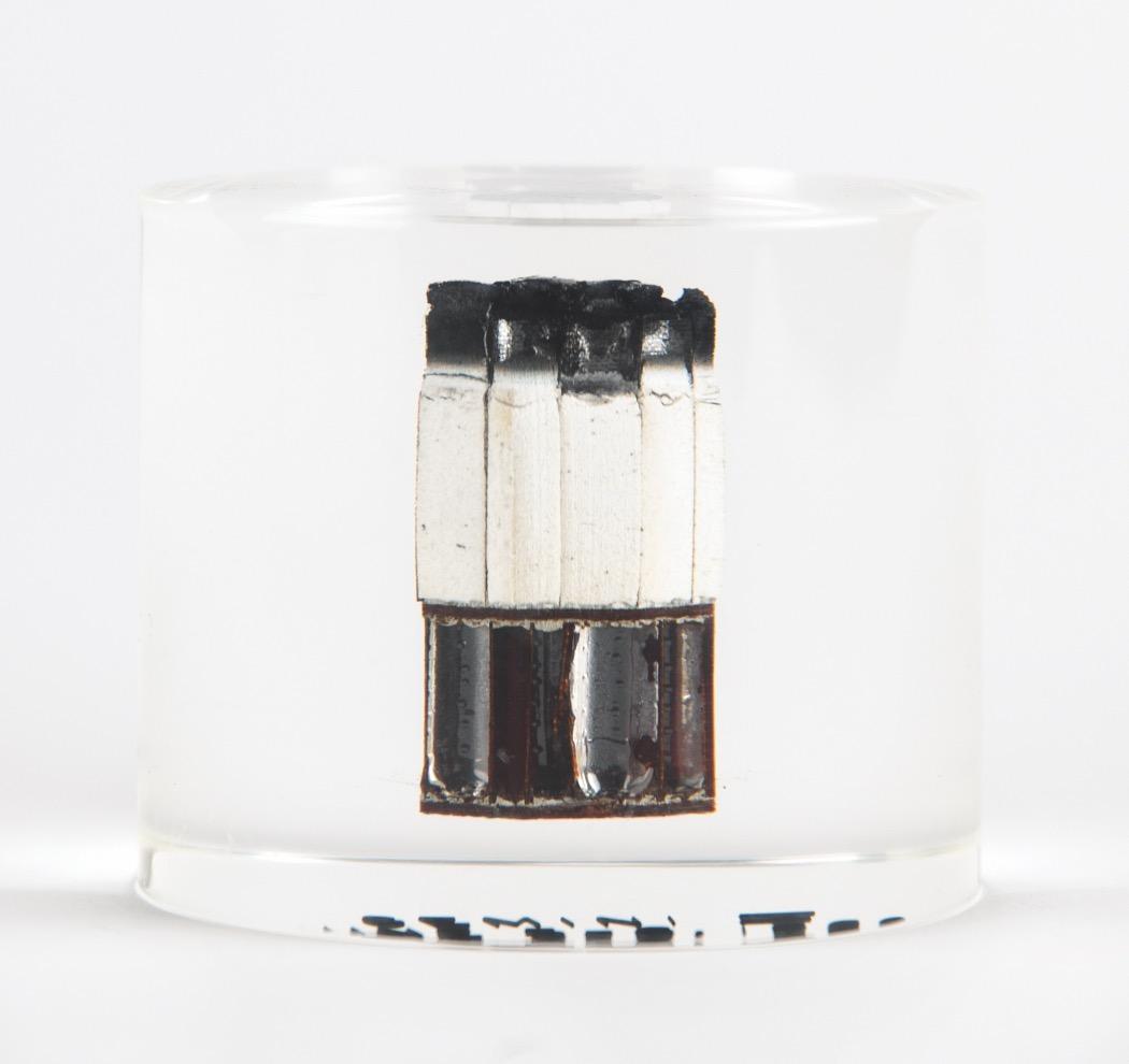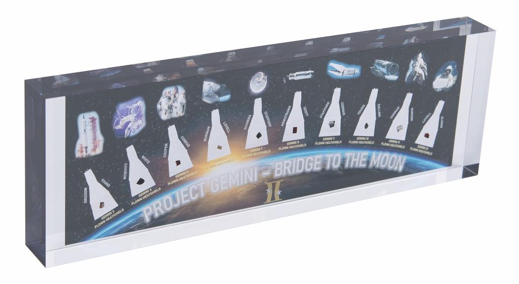 4030. Gemini 8 Flown Heatshield Pen Holder. A substantial segment of flown heat shield from the Gemini 8 spacecraft, measuring approximately 1.75” x 1” x .75” and encased in a slightly larger Lucite block that is displayed on a wooden base with an engraved plaque reading: “Heat Shield of Gemini #8, ‘First Docking in Space,’ Neil Armstrong, David Scott, 16 March 1966.” The base features two gold-tone pen-holder tubes on the left and right sides. In fine condition. Starting Bid $300