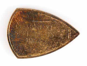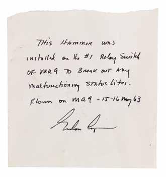 Hammer - From the Personal Collection of Gordon Cooper. Flown miniature aluminum hammer carried on the Mercury-Atlas 9 by Gordon Cooper, measuring 2˝ long and weighing a mere 3 grams, intended to be used to break any malfunctioning status lights aboard the Faith 7 spacecraft. In fine condition. Accompanied by a handwritten and signed provenance note from Gordon Cooper, in full: “This hammer was installed on the #1 Relay Switch of MA9 to break out any malfunctioning status lites. Flown on MA9—15–16 May 63.”