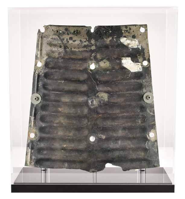 Extremely rare large flown shingle fragment from the MercuryAtlas 1 space capsule. The ribbed exterior panel measures approximately 15.75˝ x 16.5˝, and features a portion of the white painted “S” from the ‘United States’ lettering on side of the capsule. This shingle is impressively displayed in a custom-made acrylic case, measuring 18˝ x 20˝ x 7.5˝, with a scale model of John Glenn’s MA-6 ‘Friendship 7’ capsule displayed in the rear. In expected, worn condition, with curling and wear to the panel’s edges from its fiery reentry into Earth’s atmosphere.