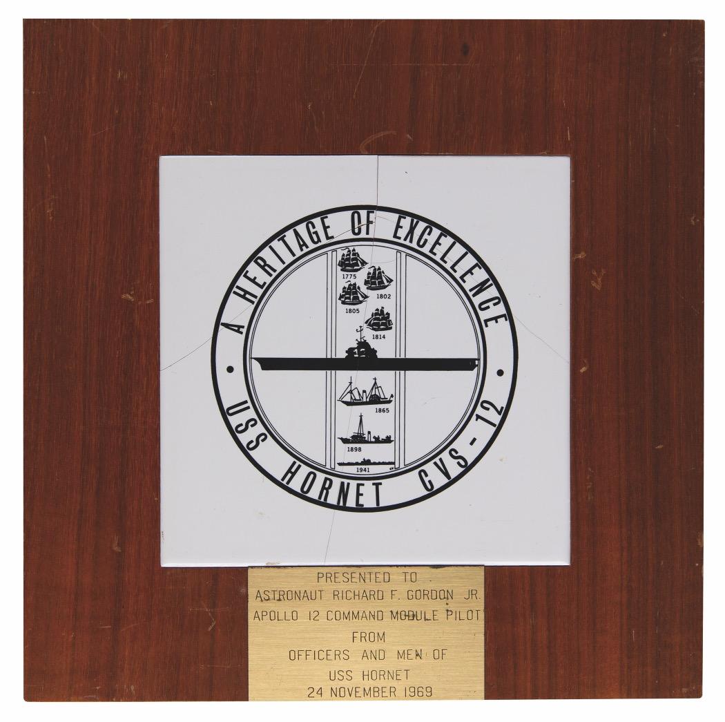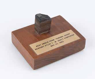 4007. Aurora 7 Flown Heatshield. A substantial segment of heat shield from the Aurora 7 spacecraft. The segment measures .75˝ x 1˝ x .5˝ and is mounted atop its original wooden display base with an engraved plaque reading: “Heat Shield from ‘Aurora Seven,’ Mercury-Atlas 7 – M. Scott Carpenter, May 24, 1962.” In fine condition. Starting Bid $200