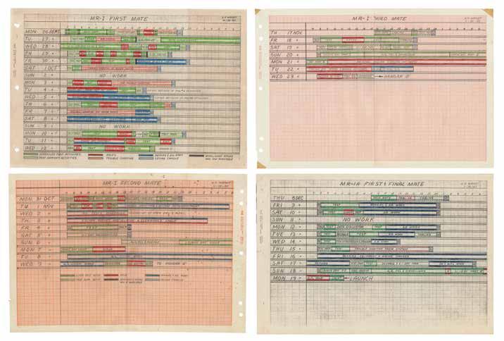 The four sheets, which are headed “MR-I First Mate,” “MR-I Second Mate,” “MR-I Third Mate,” and “MR-IA First & Final Mate,” are all dated to the last quarter of 1960: September 26 – October 12; October 31 – November 9; November 17 – 23; and December 8 – 19. These detailed timeline charts include blocks dedicated to “Schedule Test Activities,” “Test Support Activities,” “Holds,” “Trouble Shooting,” Repairs & Dr. Work,” and “Secure Capsule.” In overall fine, folded condition. An uncommon set of documents that offer a visual breakdown