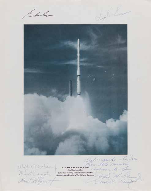 4004. Mercury 7 Signed ‘Blue Scout’ Poster. Vintage 11 x 14 poster of a Blue Scout rocket launch, as conducted by the U.S. Air Force and its 609A Blue Scout launch vehicle family, signed and inscribed in the borders in black ballpoint, “Best regards to Joe, from the Mercury Astronauts — John H. Glenn, Jr.,” “Virgil I. Grissom,” “Walter M. Schirra, Jr.,” “M. Scott Carpenter,” “Alan B. Shepard, Jr.,” and “Donald K. Slayton,” and at a later date in black ink, “Gordon Cooper.” Rolled and in fine condition, with light creasing. An appreciably rare, highly displayable format to be signed by all seven Mercury astronauts.