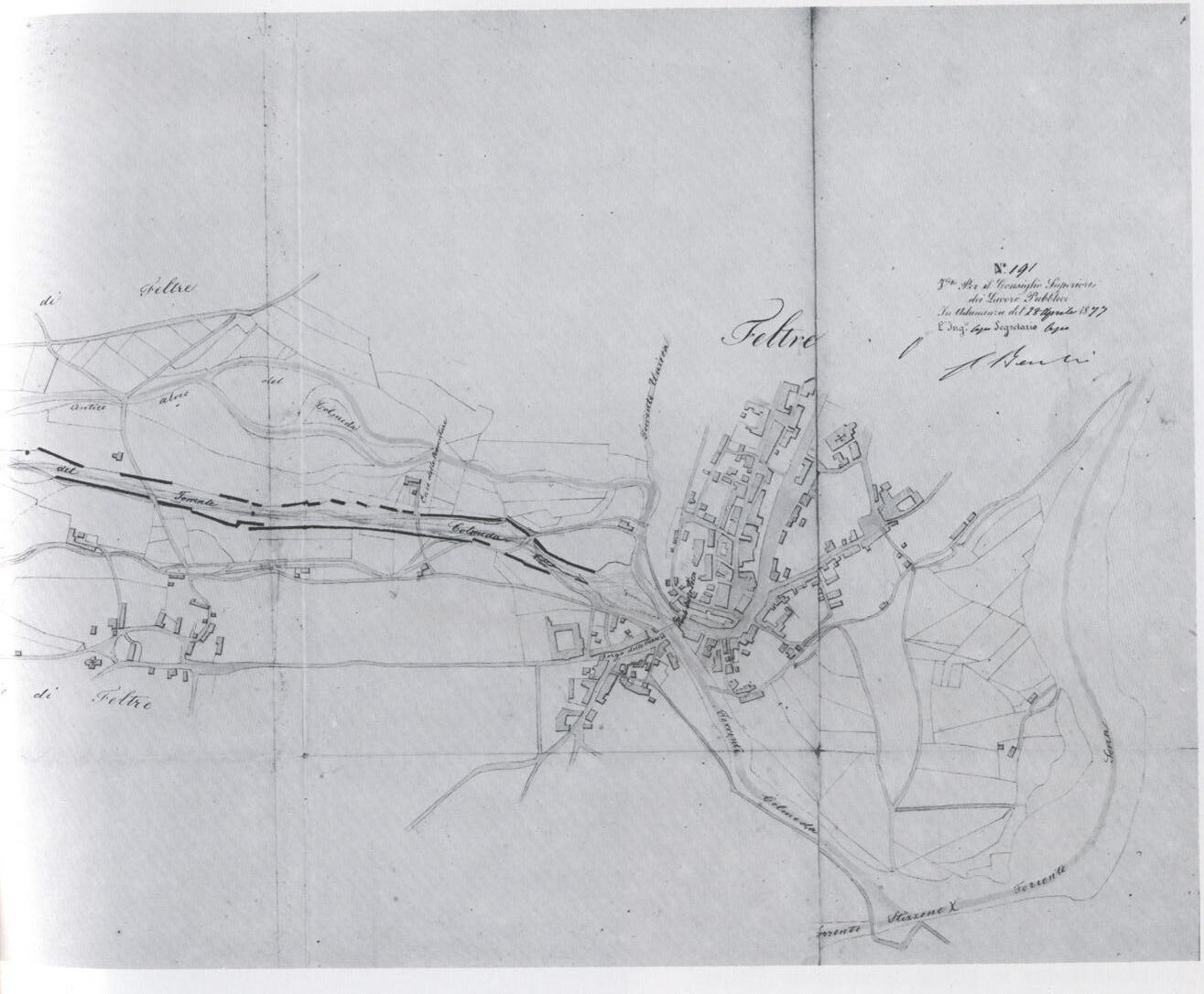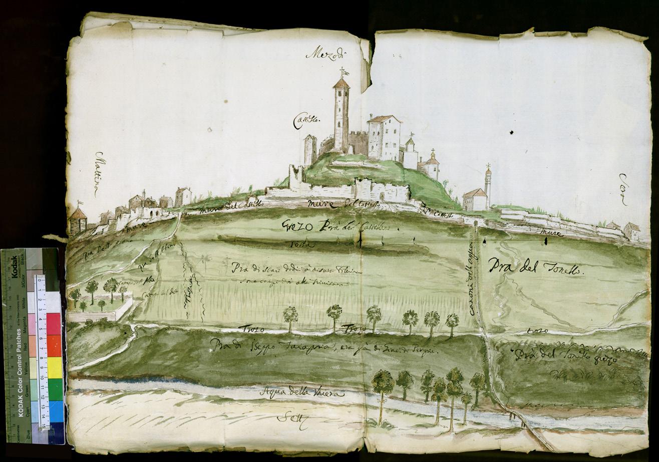 10. Archivio di stato di Venezia, Senato, Deliberazioni, Terra b.721, dis. n.1.1663 Si vede il fronte nord del Colle delle Capre, con i suoi appezzamenti agricoli, le mura medioevali in rovina ed il castello di Feltre al centro del dipinto