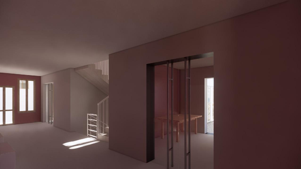 L’intervento in questo edificio prevede l’eliminazione del piano adibito a cantina, per incrementare l’altezza interpiano di quello superiore.