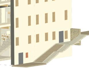 L’impronta del vecchio edificio viene mantenuta ed andrà a contenere nuove funzioni che si estenderanno interamente per ogni piano. Data l’assegnazione di due funzioni per questa scatola, queste saranno distribuite verticalmente. La funzione distributiva per questo edificio sarà assegnata ad un altro volume.