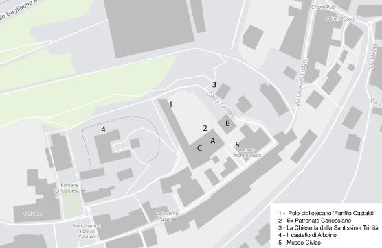 - edificio Canossiano prin cipale (edificio A) e relativo ampliamento che si connette alla biblioteca (edificio C);