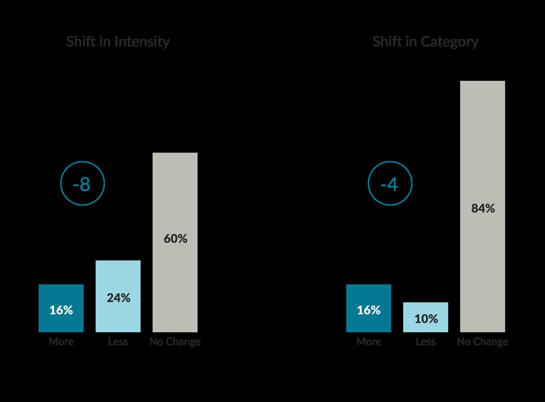 Looking at the individual level change in those who participated in both surveys shows a decline in the intensity of engagement as well. While few shifted from being engaged to not engaged, nearly a quarter shifted downward, from “very engaged” to “somewhat engaged.”