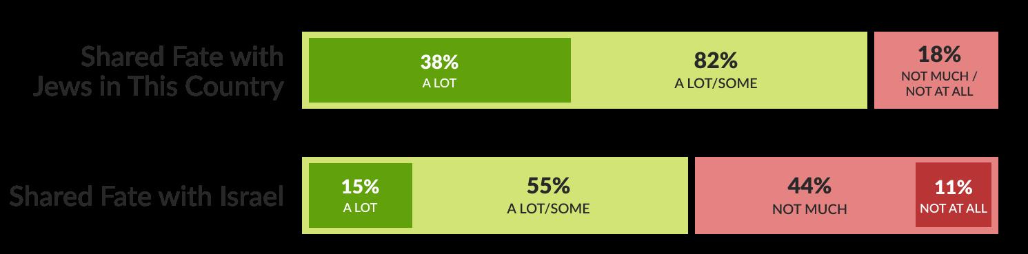 Even among the 20% who feel that being Jewish is not important to them, over a third (65%) feel this connection. One-fifth of American Jews who place less value on their Jewish identity do not feel as strongly about shared fate; only 13% of them feel it “a lot.” Still, a certain level of acknowledgment of a common bond exists.