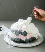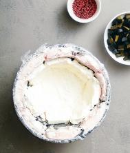 2. Fodra en rundbottnad skål (Ø 20 cm) noggrant med plastfolie. Skär lakritsbitarna i fyra delar.