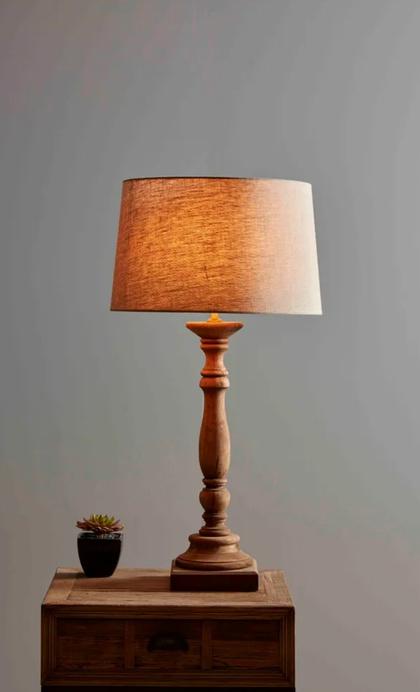 Illuminate your space with the charming appeal of the DEVON Lamp, featuring a detailed wooden base and a linen drum shape shade for a touch of casual elegance
