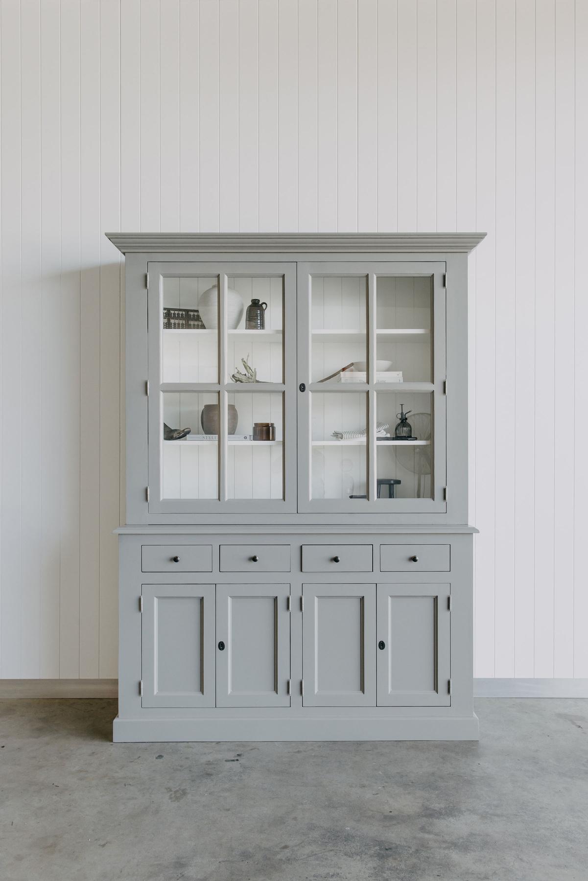 On the previous page: Our popular FRENCH WINDOW Cabinet gets a glow up this season, featuring a beautiful warm Grey tone Our signature white interior, allows your beloved collections to shine while offering ample concealed storage space