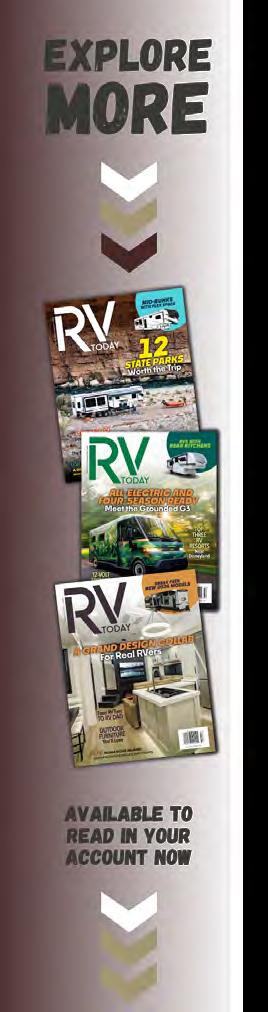 RV Today magazine is published in print and digital formats eight times yearly. The rate is $10 for a one-year digital subscription with unlimited access and downloads. The rate is $25 for a lifetime digital subscription with unlimited access and downloads. The rate is $30 for a oneyear print subscription, including eight print issues, plus complimentary digital access and downloads. Subscription rates and options are subject to change. View current pricing and subscribe at rvtoday.com/subscribe.
