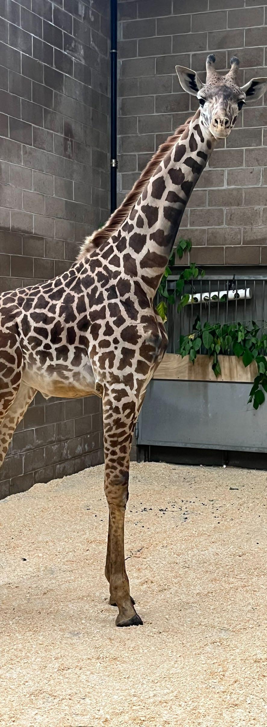 The Masai giraffe is the tallest land animal on Earth. Bulls, like Enzi, typically outweigh and outgrow females, reaching up to 2900 pounds and a height of up to 18 feet. In the wild, these giraffes can live up to 25 years, with lifespans often extending further in managed habitats. One of its most distinctive features is its long neck, composed of seven vertebrae, which account for about one-third of its body height. Enzi, at 11 months, weighs 730 pounds and is about 10 feet tall.