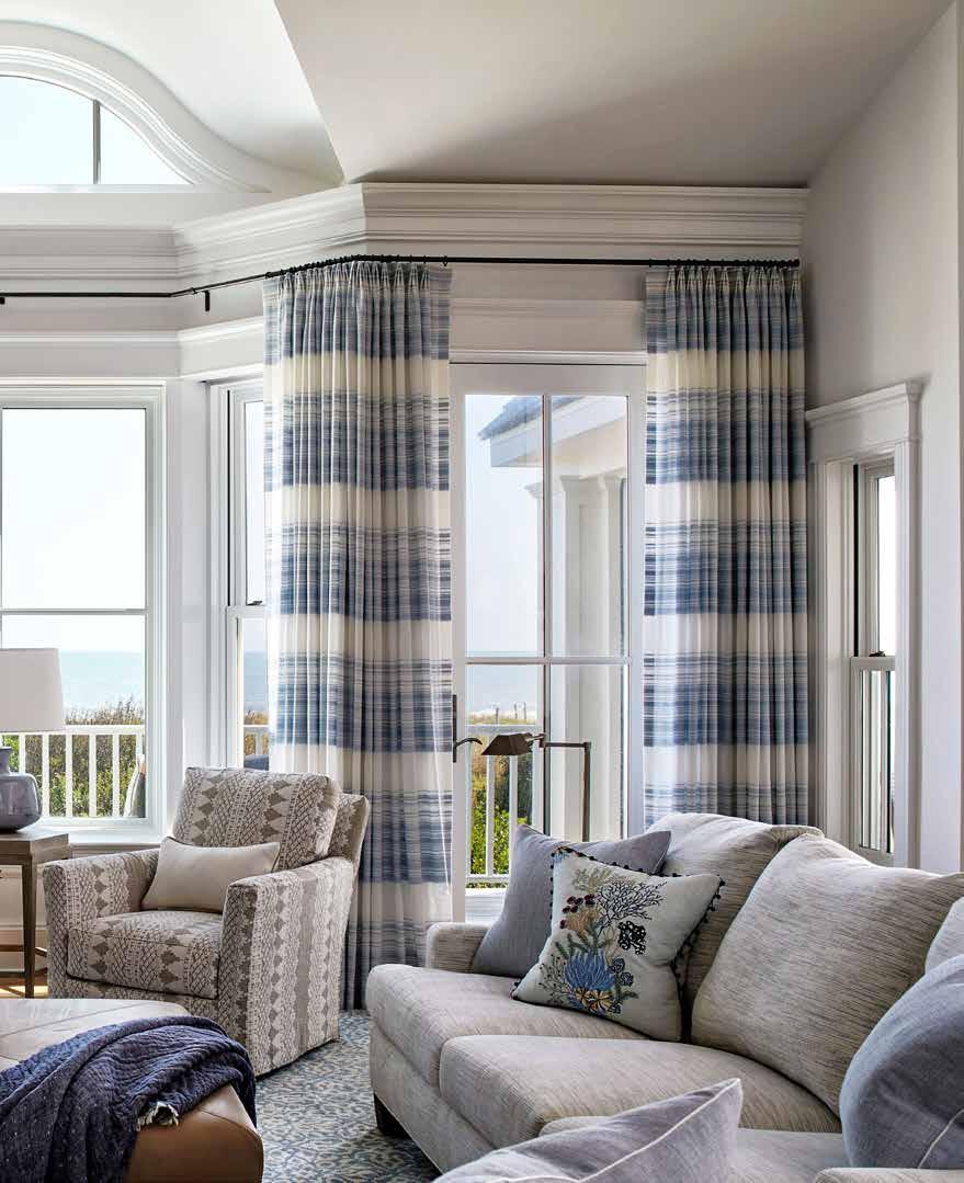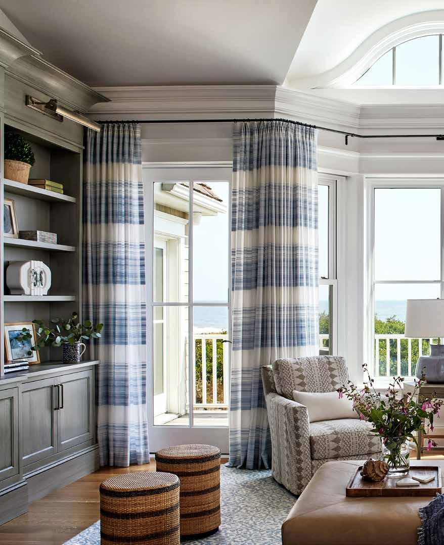 She notes that most of the color in the room comes from the blue and white window treatments, which have strong horizontal stripes. “We wanted the room to feel calm and expansive,” she says,