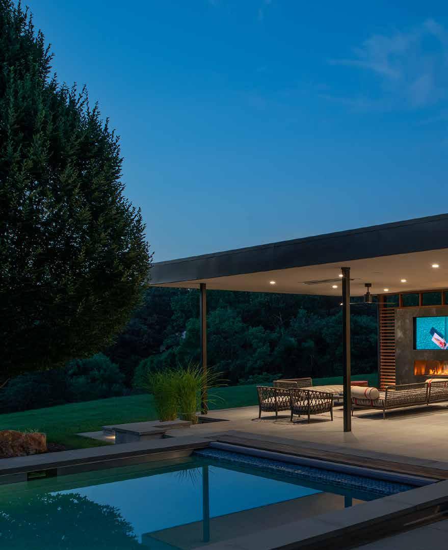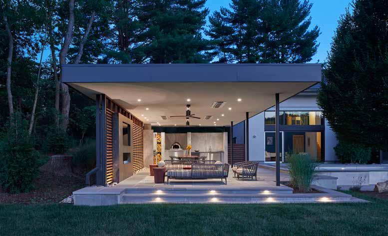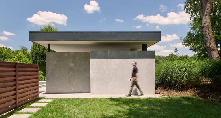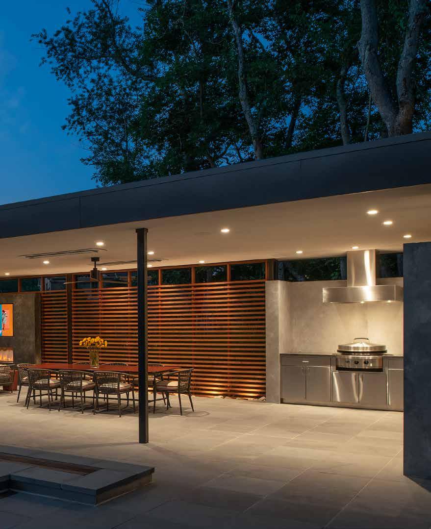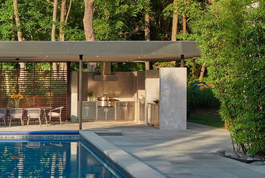 The mahogany trellis adds an element of interest and connects the pavilion with its natural surroundings. “This pavilion uses some cold materials, but what really helps warm it up is that stained wood trellis,” Kaufman says. “Wood brings a natural warmth. The way we designed it, we have openings every two inches, so what you see through the trellis is green. When your outdoor and indoor space feel connected, it makes a difference.”