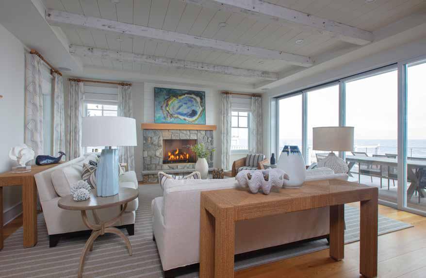 The home has an upside-down floor plan, with main living areas on the second floor to take advantage of breezes and views. One enters from the ground level, stepping into an intimate foyer with floors of Portuguese marble. Straight ahead is the family room with a giant arched window. “You know where you are... you have the dunes and the ocean right out there,” observes Crosby. Its bar and casual furniture groupings encourage visitors to lounge and play games.