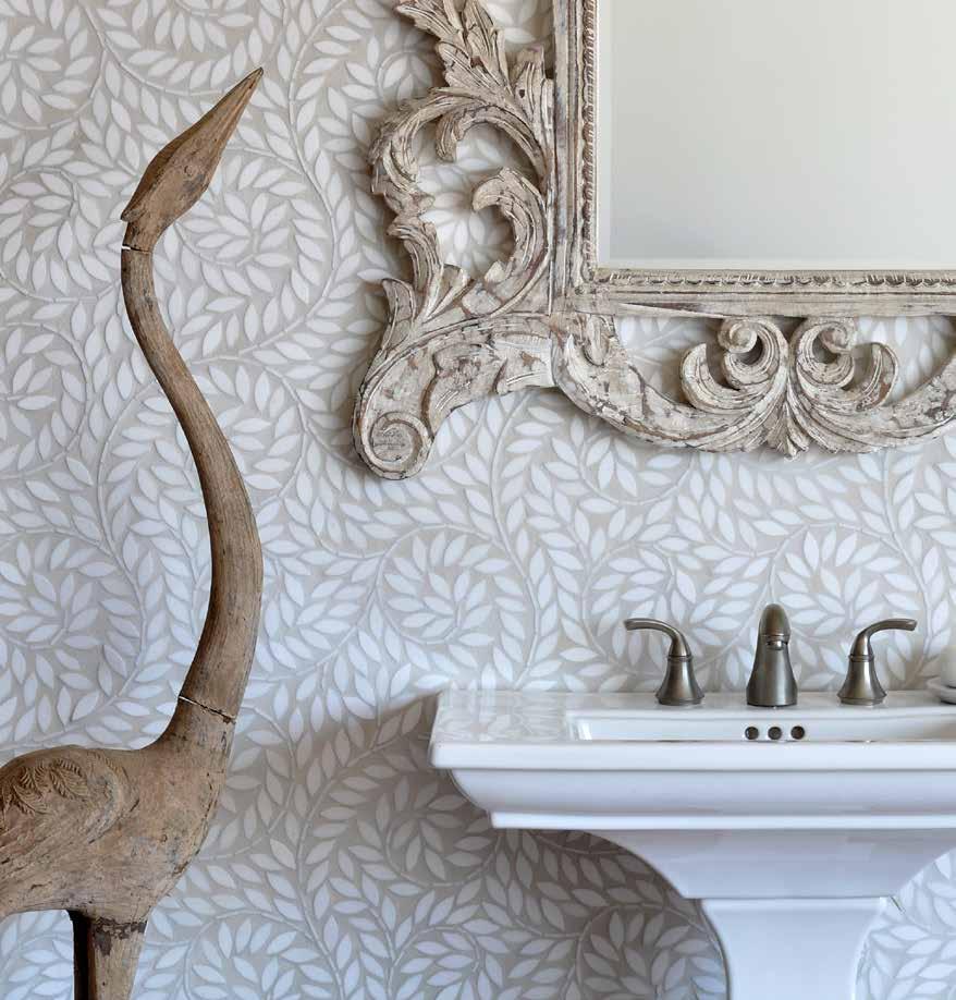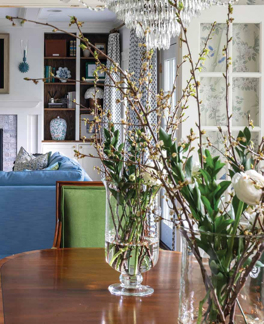 The overall decor coheres from afar, but close inspection reveals varied patterns and textures. “We started with things we loved, such as the striped Schumacher upholstery on the chairs. It was cream and taupe, so we could pull in any color,” she explains. And because the window treatments had such dramatic patterns, the sofa is all about texture, she points out. “Natural materials and textures soften the environment. I think leather on the coffee table warms it up in a non-beachy way, yet as a natural material, it is forgiving, soft, and cozy.” A decorative finish on their cabinetry is cool as opposed to warm. “It’s a maple with a grey glaze on it that allowed it to feel more wintery as opposed to bright white,” explains Crosby.
