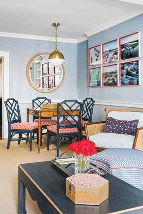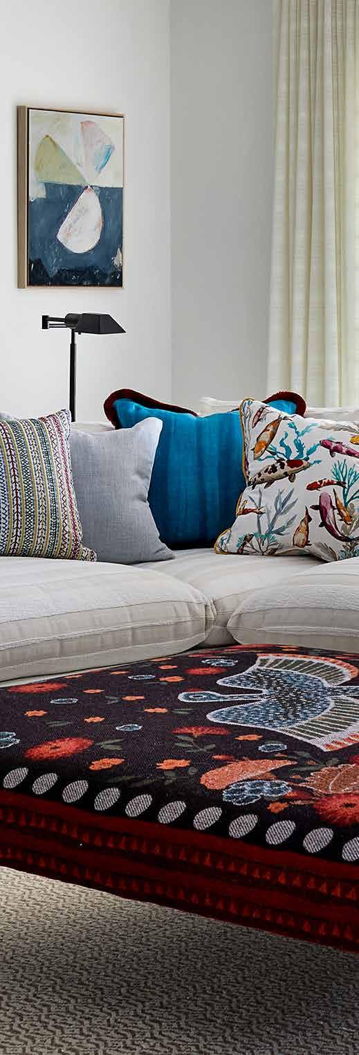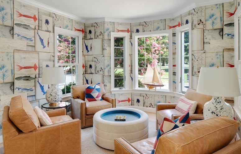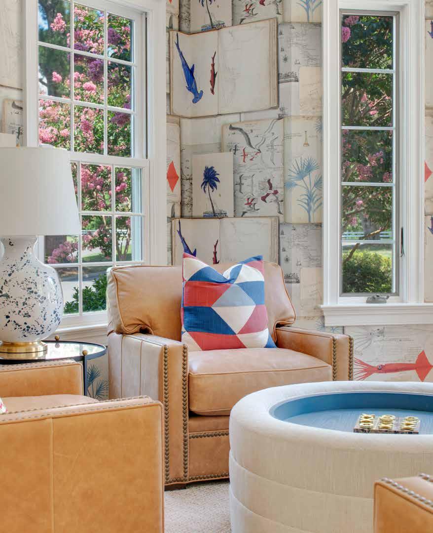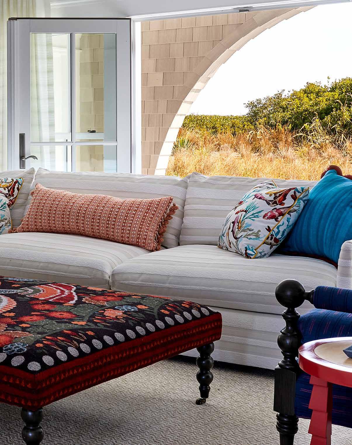 Three bedrooms for the homeowners’ adult children adjoin the family room, so the mood here is playful. Color is foregrounded. There are lots of corals and reds, including a vibrant blue and beachy teal. “It is a nautical palette that does not quite read nautical. It is more playful, yet has some blue and white,” says Crosby.