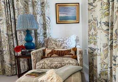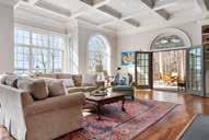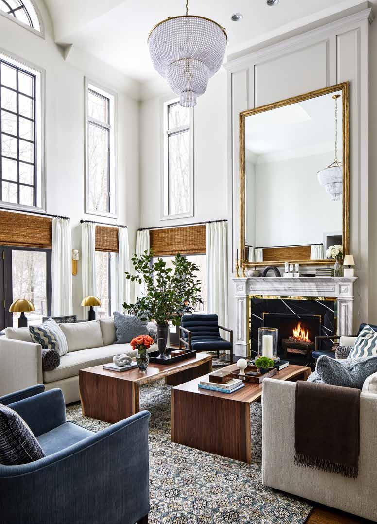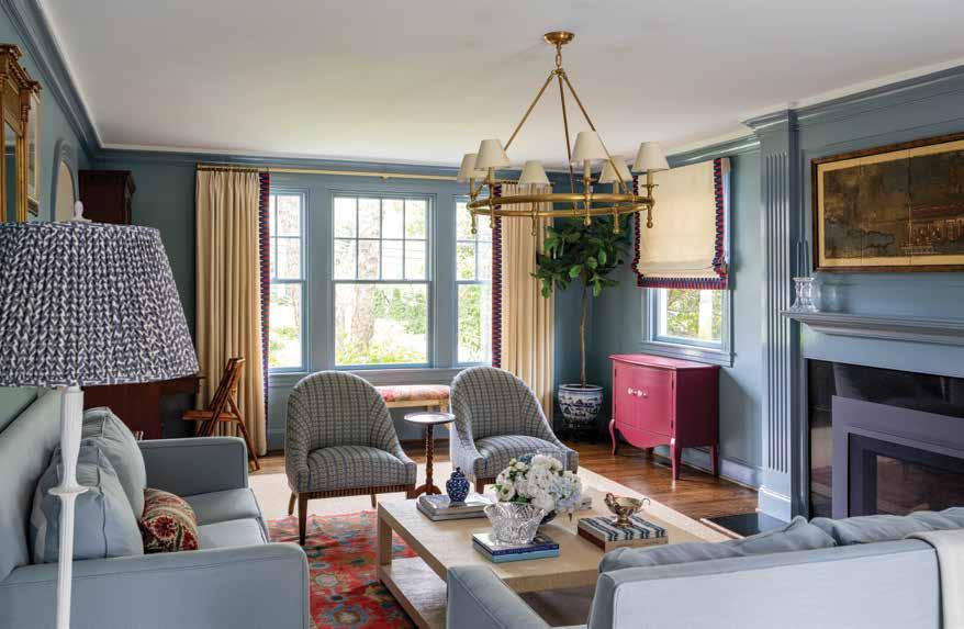 In the living room, the walls are white; color comes from window treatments and furnishings. To keep things interesting, Katherine Crosby designed millwork and paneling on areas of the ceiling and walls.
