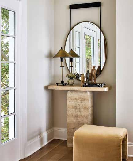 A sweeping stair echoes the curves and arches on the home’s front-facing façade as it ascends to the living room, the hub of the home. With 15-foot ceilings, it is a room for dreaming and conversation. There is a spatial discipline throughout, a clarity in calm furniture groupings and appointments that echo the architecture’s vaulted ceiling and recessed forms. What makes this area especially distinct are the fine furnishings and finishes expected in a main residence. Nothing is trendy or nautical-themed. “My clients were firm about wanting to be respectful of the ocean, but they did not want a ‘beachy’ home. They wanted to be here and not feel the pressure to be ‘beachy.’” For this reason, she explains, some of the chairs and sofas face in as opposed to out.