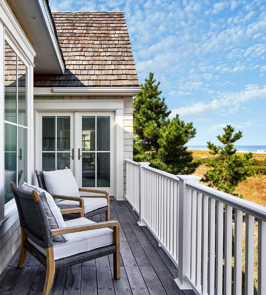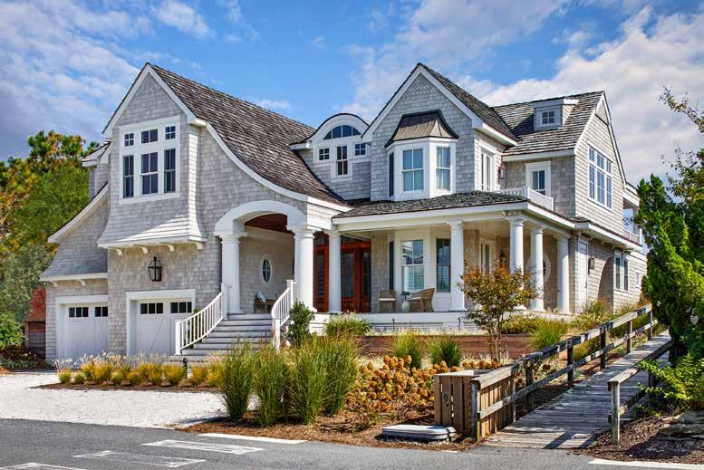 Rising from the dunes of Bethany Beach, this shingle-style home beckons sunlight and the great rhythms of the ocean into spaces both intimate and grand. Its architecture, conceived by Christopher L. Pattey of Becker Morgan Group, embraces large open spaces for the main living areas as well as smaller, more private spaces. Its sloping rooflines, eyebrow windows, and dormers create different interior ceiling shapes and heights. “Usually, these beautiful elements on the outside disappear into an attic,” says Pattey.