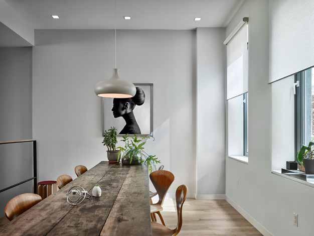 The living room, which faces east, has very high ceilings, which made lighting the room especially challenging. “Here, we needed to bring the lighting down to a more human scale,” she says. There is one table lamp and some reading lamps. To help manage the sun pouring into the home, she worked with the architect to design built-in recessed shades for light control.
