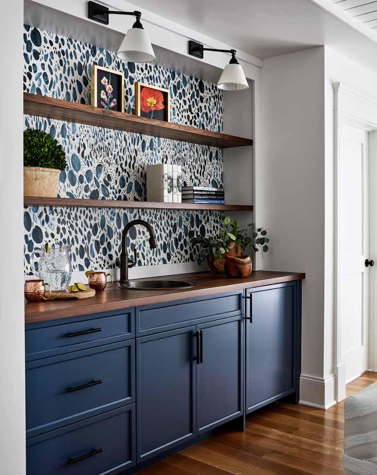 Daring wallpaper at the back of the bar in the family room is fun and unexpected.
