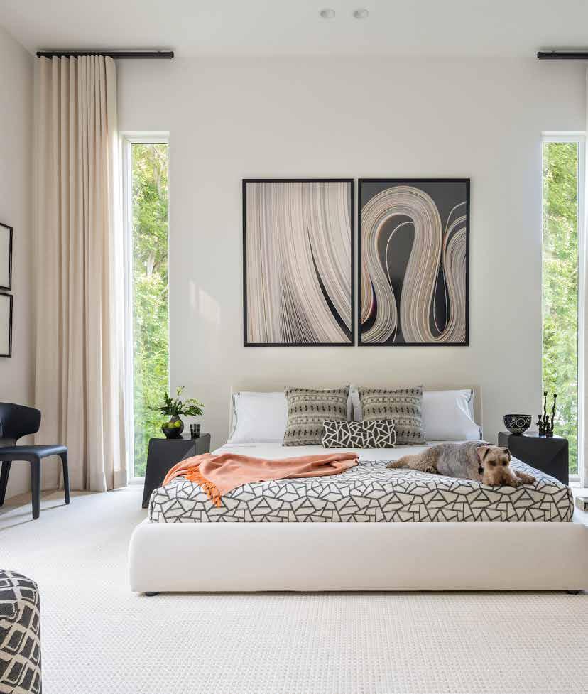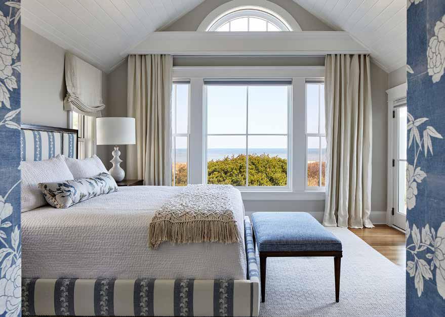 The design rhythms in this home are never broken by superfluous furnishings or random appointments. The powder room is warmed by a natural wood custom vanity, with symmetrical mirrors placed on both sides of the sink. “The window becomes the third mirror,” says Crosby. The hallway leading to the primary suite is wallpapered in vibrant greens and blues. In stark contrast, the primary suite is exceptionally calm. Controlling the light in this room was tricky. “We did a double wall layer; behind is a horizontal blackout shade and a light-filtering shade. The scale of the room is modest; all the bedrooms have the same level of finish, so everyone feels equally special,” notes Crosby. Yet, the suite opens to a deck with magnificent dune and ocean views. Here is the best of both worlds.