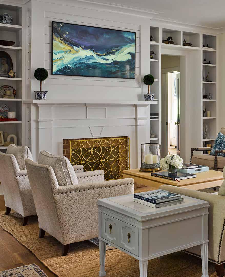 Various ceiling heights and a light-flooded, highly reflective interior posed challenges to interior designer Katherine Crosby of Crosby Jenkins Associates. She had to manage layers of light as well as conceive a design that responded to the home’s expansive scale and the family’s need for a homey, cozy ambiance.