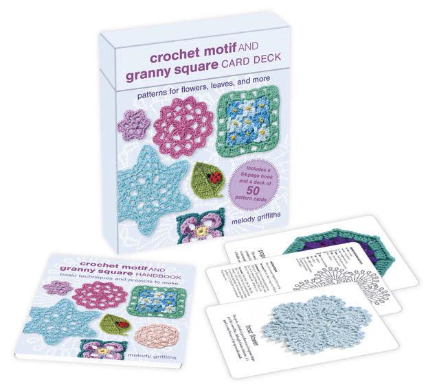 Crochet gorgeous motifs, blocks, and squares with this stylish boxed set which includes a 64-page book and 50 pattern cards. These colorful mini designs, inspired by nature, are perfect for crocheting on the go. Ideal for beginners through to experienced crafters, the eye-catching designs are perfect for trying out new techniques and using up yarn from your stash. The deck features 50 gorgeous pattern cards for naturethemed granny squares and motifs, from a forget-me-not square to a 3D daffodil and a ladybug on a leaf. All are fast, fun, and so rewarding to create. Each card features a photo of the motif on the front, and the pattern on the back. Many cards also include a handy stitch chart. The 64-page book includes step-by-step illustrations for all the stitches you’ll need and a guide on how to read the charts. There are also ideas and patterns for what to make with your finished blocks, from greetings cards to a pretty flower scarf—once you start, you’ll realize that the possibilities are endless.