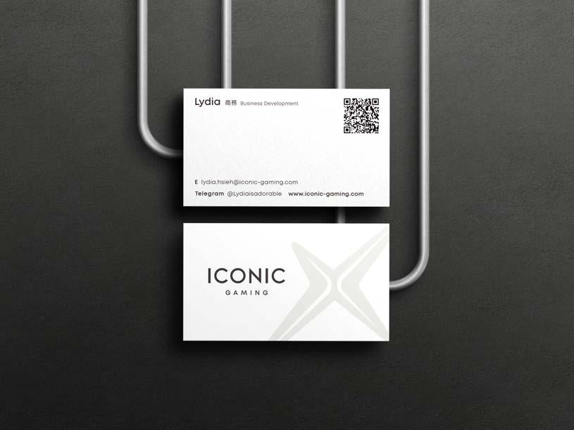 低調奢華的銀黑色一直是Iconic Gaming的形象指標,印 刷上使用燙銀來顯現標準字的質感。Logo部分則使用珍 珠箔燙印特有的光澤來表現出品牌象徵「新星」所代表的 意義。
