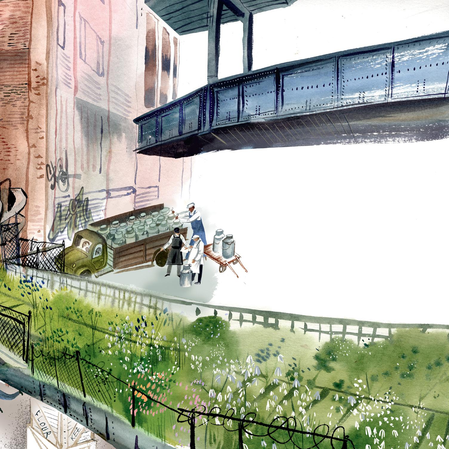 A long, clanging train, blowing its horn, barreled along the tracks through the streets of New York City. Its destination was a big factory on the West Side. The train was loud and dirty, but the people of the City needed it: It carried countless bags of flour, crates of coal, and cisterns of milk to the factories that baked bread and packaged meat and milk.