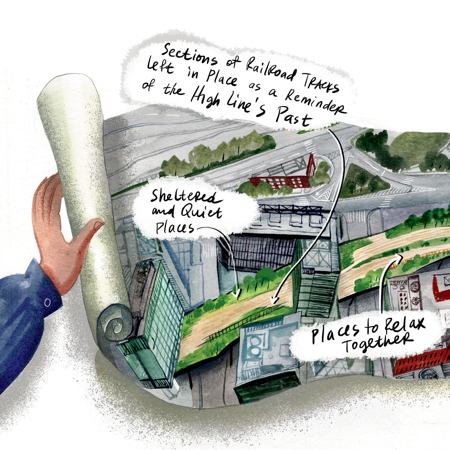 I went to architecture school in New York, and my classmates and I loved to explore the city, looking for the “undiscovered” spots in the midst of the urban hustle and bustle. We wandered around all five boroughs, sketching, taking endless photos, admiring the beauty of the abandoned warehouses, docks, and factories. One day, somewhere in Chelsea, we discovered a rickety metal ladder leading up to the forgotten train tracks above our heads. The sidewalk was full of people, but we seemed to be the only ones who noticed the ladder. We did not hesitate to climb up. It was like entering Narnia: Grasses and wildflowers swayed, trees rustled, butterflies fluttered. Incredible panoramas of the river and the streets below unfolded just for us. It was quiet, mysterious, even a little dangerous. It was the most unique place we’d seen. We couldn’t stop talking about how it could be brought back to life and shared with the community.