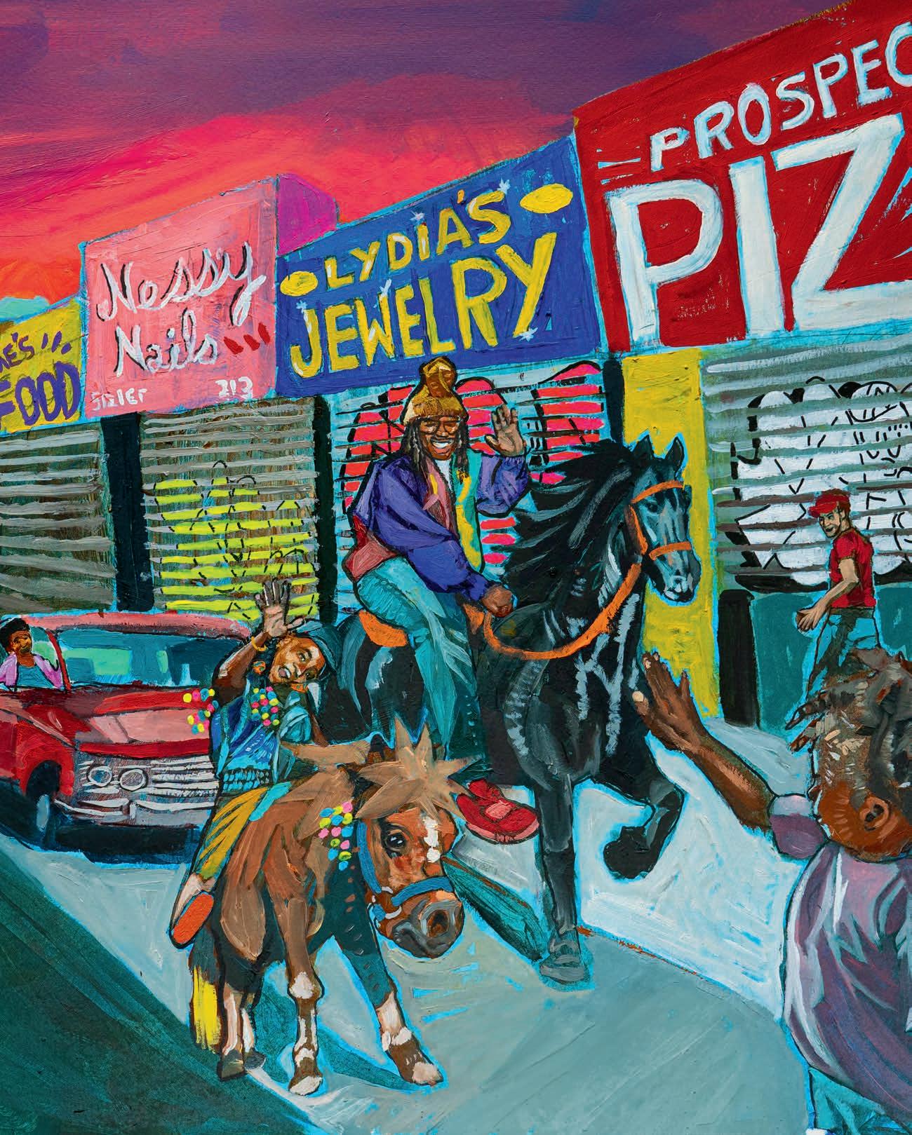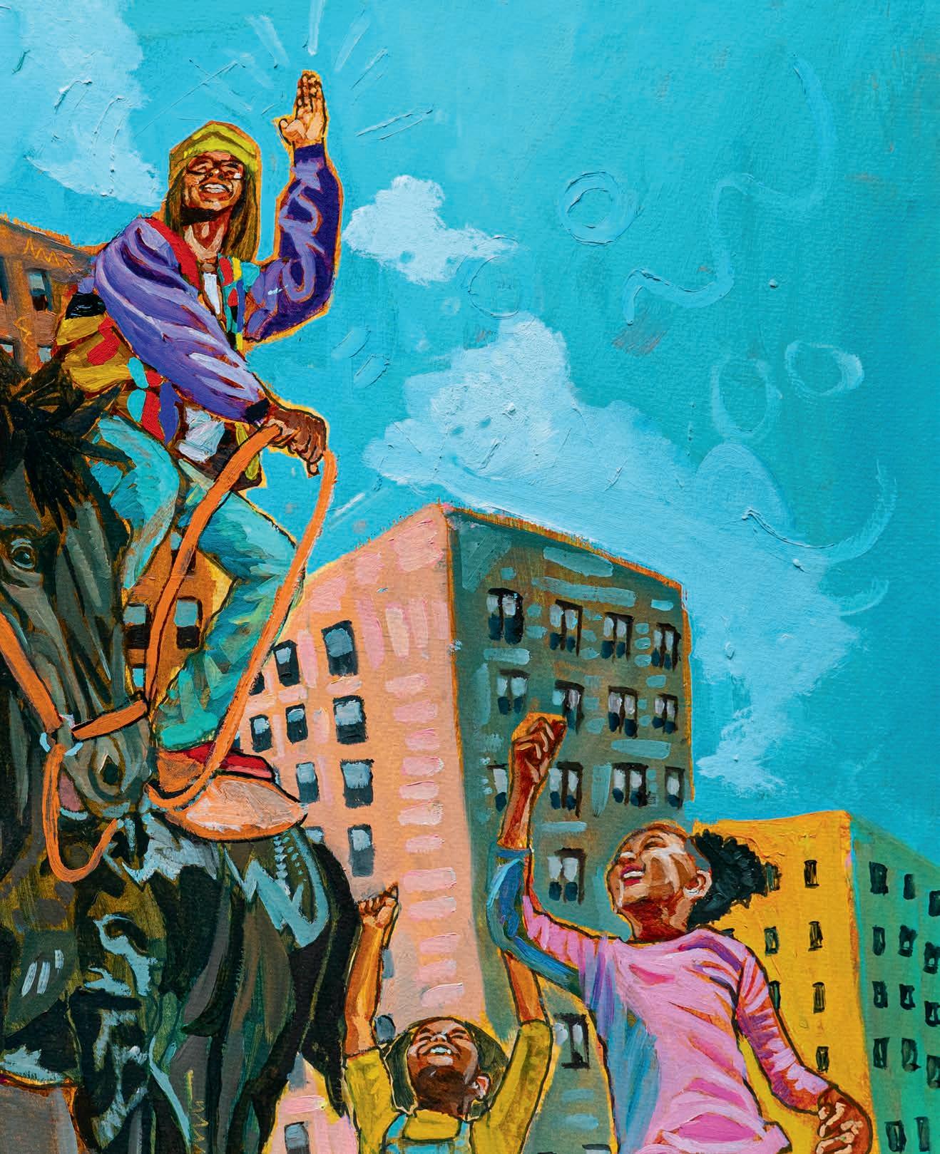 Daddy’s strong arms lift me right onto Clover’s back. Then, quick as a wink, Daddy is on Power, and we ride out onto the street.