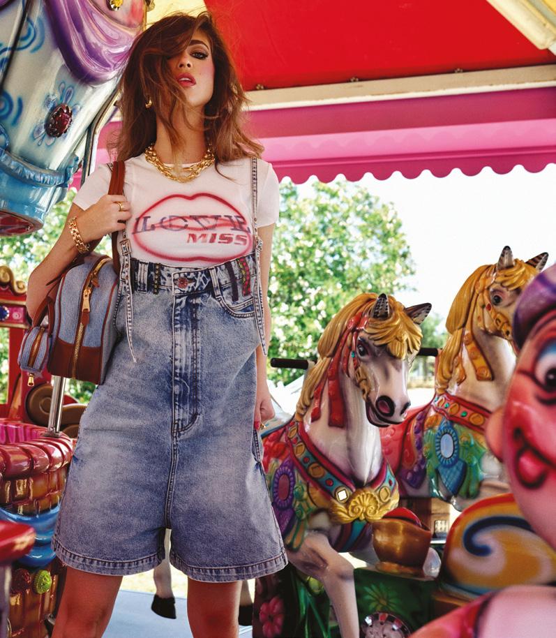 A vibrant Miss 60 fashion shoot set in a colorful fun park, showcasing the latest denim trends with playful energy and bold style.