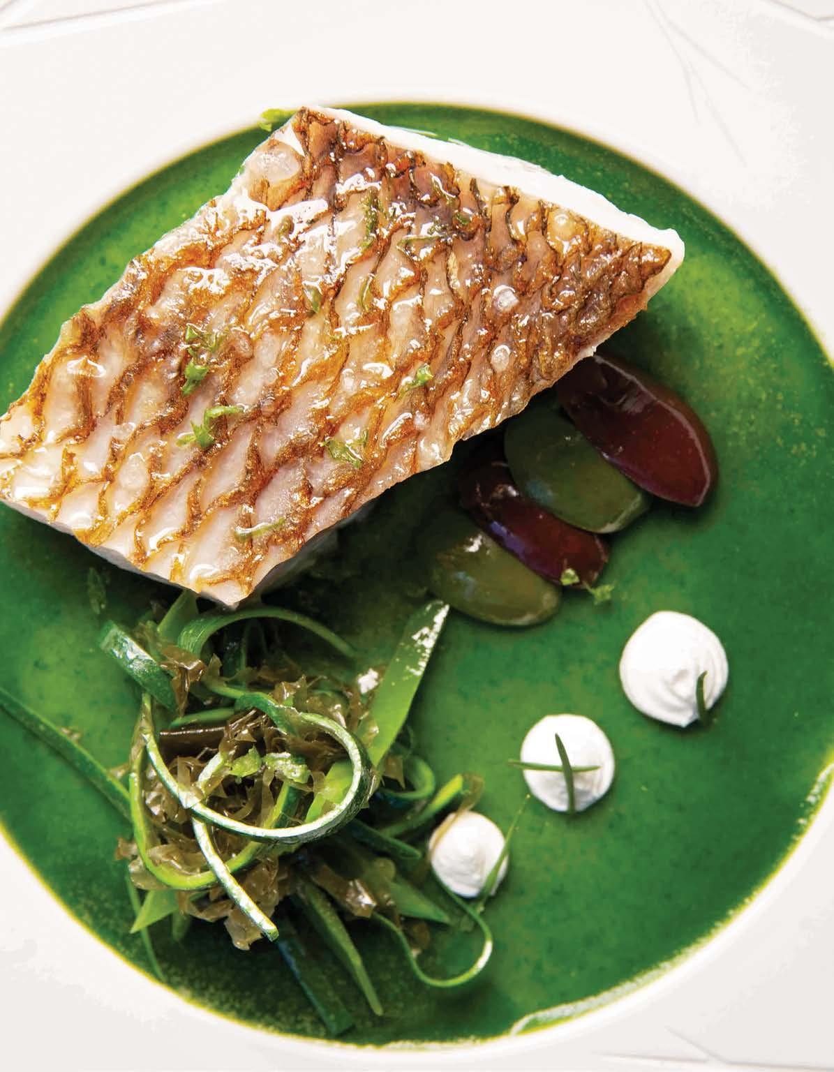 Featuring fresh red snapper on a base of organic algae chlorophyll, with a refreshing seaweed salad and olives.