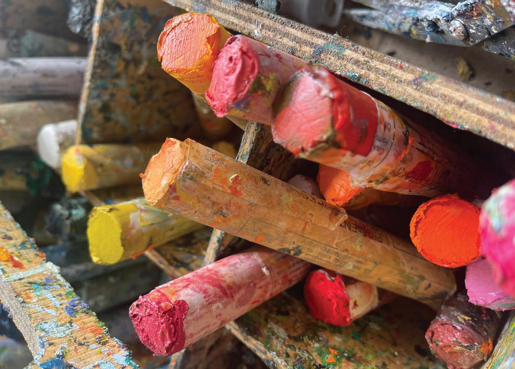 “I can draw in trees to a painting, and I’ll draw in the reflections in the water with the oil sticks,” she says.