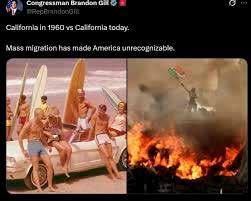 Gill, who represents Texas’s 26th Congressional District and is aligned with the far-right wing of the GOP, shared a post comparing two images of California: one from the 1960s showing a calm beach scene with blonde sunbathers, and another from the L.A. riots featuring a man waving a Mexican flag. He captioned it: “California in 1960 vs. California today. Mass migration has made America unrecognizable.”