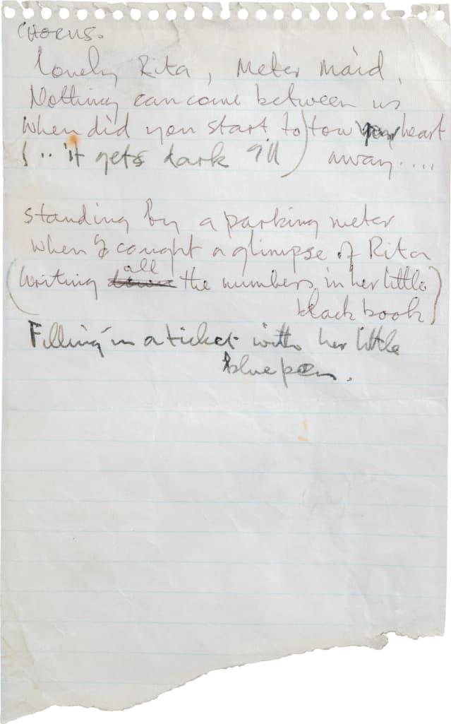 Handwritten on an irregularly sized scrap of lined paper from a spiral notebook, Paul McCartney’s lyrics to the Beatles’ 1967 hit, “Lovely Rita, Meter Maid” were framed with a full size uncorrected first proof photograph of the album cover for Sgt. Pepper’s Lonely Hearts Club Band. Biblioctopus had priced it at $650,000.