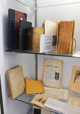 For those whose interests leaned toward occult or macabre, Alastor Rare Books, making its debut at the NYIABF, had a Seventeenth Century invocation of spirits (top shelf) in the same case as a brochure for artificial limbs by M. Masters (bottom shelf). East Cowes, U.K.