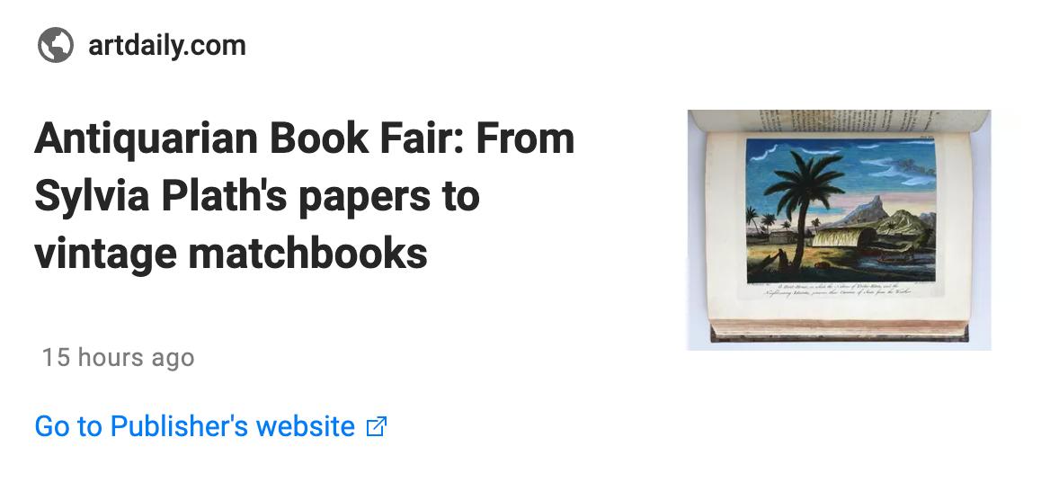 The New York Times Online US Mike Cotter Profile with NYIABF Mention The Surfer Dude Behind a Famous Jewel Heist Corey Kilgannon 97,000,000 $897,250 4/5/24 British Vogue Online US Lux Mentis BaT Piece Would You Buy a $1.5 Million Copy of Breakfast at Tiffany’s? Lilah Ramzi 5,300,000 $49,025 x 4/5/24 Associated Press Online US NYIABF Highlights Video Beatles, Nirvana, BAFTA, Sylvia Plath headline NY Antiquarian Book Fair Staff Writer 47,400,000 $438,450 4/5/24 Fine Books & Collections Online US Peter Harrington Piece Robert Giroux's Copy of On the Road Scroll at New York International Antiquarian Book Fair Staff Writer 160,000 $1,480 x 4/5/24 New York Post Online US NYC Event Round Up Feast at Beefbar, learn watchmaking secrets and other NYC events this week Rima Suqi 90,000,000 $832,500 4/5/24 Associated Press Online US Youtube Video Beatles, Nirvana, BAFTA, Sylvia Plath headline NY Antiquarian Book Fair Staff Writer 2,800,000 $25,900 x 4/5/24 Mississippi Valley Publishing Online US Video Pick Up Beatles, Nirvana, BAFTA, Sylvia Plath headline NY Antiquarian Book Fair Staff Writer N/A N/A 4/5/24 Yahoo! Entertainment Online US Video Pick Up Beatles, Nirvana, BAFTA, Sylvia Plath headline NY Antiquarian Book Fair Staff Writer 41,000,000 $379,250 4/5/24 The Skint Online US Event Listing FRI-MON, 4/5-8: SKINT WEEKEND Staff Writer N/A N/A 4/5/24 Monocle Broadcast UK NYIABF Announcement The Monocle Minute Staff Writer 80,200 $742 4/5/24 Turkiye Online TR NYIABF Announcement/Ottoman Books Video New York'ta Osmanlı eserleri ilgi çekti! Amerikalılar kadim kitaplara hayran kaldı Ali Tüfekçi N/A N/A x 4/5/24 The Lufkin Daily News Online US Video Pick Up Beatles, Nirvana, BAFTA, Sylvia Plath headline NY Antiquarian Book Fair Staff Writer N/A N/A x 4/5/24 Iosco-County News Herald Online US Video Pick Up Beatles, Nirvana, BAFTA, Sylvia Plath headline NY Antiquarian Book Fair Staff Writer N/A N/A x 4/5/24 ABS-CBN News Online US Pick Up Book bound in human skin is showcased at New York fair Staff Writer 640,000 $5,920 x 4/5/24 The Star Online US Pick Up Book bound in human skin is showcased at New York fair Staff Writer 1,360,000 $12,580 4/5/24 The New York Times Print US NYIABF Highlights From Sylvia Plath’s Papers to Pulp Novels Jennifer Schuessler 4,800,000 $44,400 4/5/24 YouTube Online US Lux Mentis BaT Piece Would You Buy a $1.5 Million Copy of 'Breakfast at Tiffany's'? (USA/Global) 5/April/2024 Mark1333 34,200 $316 x 4/5/24 Gothamist Online US Event Round Up Early Addition: Law & Order: SVU and the MetroCard, two icons that refuse to be phased out, join forces James Ramsay 2,000,000 $18,500 4/5/24 Business of Home Online US Collab Round Up Can’t-miss collaborations from Little Wing Lee and RBW, Teklan and Layered, and more Caroline Biggs 32,000 $296 4/5/24 YouTube Online US NYIABF Highlights Video New York International Antiquarian Book Fair Beth Frank 15,400 $142 4/5/24 Aspire Design & Home Online US ABAA NYIABF Piece The ABAA Celebrates 75 Years At The New York International Antiquarian Book Fair Deborah L. Martin 550,000 $5,088 x 4/5/24 Brilliant Adventures Online US Blog/NYIABF Mention “I’ve had a love of my own, like yours-“ Andrew Lucre N/A N/A 4/5/24 Out Traveler Online US Type Punch Matrix Gay Cookbook Piece Rare print of campy pre-Stonewall ‘The Gay Cookbook’ on sale this weekend in NYC Donald Padgett 7,800,000 $72,150 4/5/24 Hyperallergic Online US NYIABF Highlights The New York Antiquarian Book Fair Returns With Its Eclectic Clamo Elaine Velie 1,000,000 $9,250 x 4/5/24 Advocate Online US Pick Up Rare print of campy pre-Stonewall ‘The Gay Cookbook’ on sale this weekend in NYC Donald Padgett 7,800,000 $72,150 x 4/5/24 Newsbreak Online US Article Link Antiquarian Book Fair: From Sylvia Plath's papers to vintage matchbooks Staff Writer 40,000,000 $370,000 x 4/5/24 Primicias Online EC Spanish NYIABF Highlights Rarezas de Cervantes y Neruda brillan en la feria del libro antiguo en Nueva York Staff Writer N/A N/A 4/6/24 Art Daily Online US NYIABF Announcement Antiquarian Book Fair: From Sylvia Plath's papers to vintage matchbooks Jennifer Schuessler 64,319 $595 4/6/24 Fine Books & Collections Online US The Discovery of America catalogue piece Consortium offers 'Discovery of America' Catalogue at New York International Antiquarian Book Fair Staff Writer 160,000 $1,480 4/6/24 Barron's Penta Online US Lux Mentis BaT Piece Breakfast at Tiffany's' copy on sale in new York for $1.5 million Nicolas Revise 2,500,000 $23,125 x 4/6/24 France24 Online FR Pick Up Breakfast at Tiffany's' copy on sale in new York for $1.5 million Nicolas Revise 2,100,000 $19,425 4/6/24 Yahoo! Finance Online US Pick Up Breakfast at Tiffany's' copy on sale in new York for $1.5 million Nicolas Revise 93,000,000 $860,250 x 4/6/24 La Libre Belgique Online BE Pick Up Le livre "Petit déjeuner chez Tiffany" couvert de diamants pour 1,5 million de dollars Nicolas Revise 230,977 $2,137 x 4/6/24 Middlebrow Musings Online US Blog Post Surrounded by Books and Book Lovers Michael Maiello N/A N/A x 4/6/24 The Peninsula Qatar Online QTAR Pick Up Breakfast at Tiffany's' copy on sale in New York for $1.5 million Nicolas Revise N/A N/A 4/6/24 The Straits Times Online US Pick Up Breakfast at Tiffany's' copy on sale in New York for $1.5 million Nicolas Revise 574,000 $5,310 4/6/24 Times of Malta Online UK Pick Up Breakfast at Tiffany's' copy on sale in New York for $1.5 million Nicolas Revise 1,300,000 $12,025 x 4/6/24 Watauga Democrat Online US Pick Up Breakfast at Tiffany's' copy on sale in New York for $1.5 million Nicolas Revise 900,000 $8,325 x 4/6/24 News-Topic Online US Pick Up Breakfast at Tiffany's' copy on sale in New York for $1.5 million Nicolas Revise N/A N/A x 4/6/24 6 KPVI Online US Pick Up Breakfast at Tiffany's' copy on sale in New York for $1.5 million Nicolas Revise N/A N/A x 4/6/24 The Bryan Times Online US Pick Up Breakfast at Tiffany's' copy on sale in New York for $1.5 million Nicolas Revise N/A N