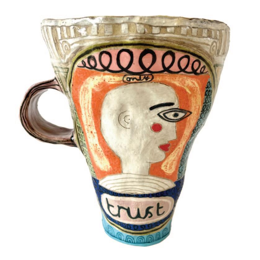 The Cup of Integrity 2022, handbuilt, stoneware decorated with slips, oxides and underglaze, transparent glaze