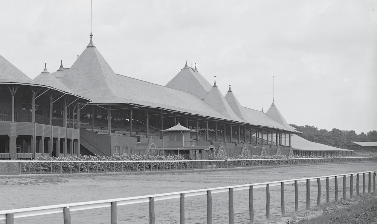 Warren-designed original Saratoga clubhouse with 2-story piazza and conical turrets in the foreground, grandstand with pyramidal turrets center, and betting ring far right. Configuration following the 1902 track revision, where these three structures were relocated. Credit: Library of Congress, Call Number 2016804084.