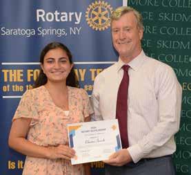The Saratoga Springs Rotary Education Foundation raises funds to give financial scholarships to deserving high school seniors who plan to pursue additional education. The Foundation (SaratogaSpringsScholarships.org) is a 501(c)(3) charitable organization which partners with the Rotary Club of Saratoga Springs to award scholarships. The Saratoga Springs Rotary Education Foundation awarded $100,000 in scholarships to 15 local students. One-year scholarships ranged in amounts from $2,500 to $6,000. In addition, one high school senior is selected to receive our Presidential Scholarship. The winner of this award receives $5,000 per year for four years. The winner of the Presidential Scholarship is Elaina Jacob who will attend University at Buffalo to major in Biomedical Sciences. Miss Jacob gave an impassioned thank you after receiving the scholarship. She told the attendees that she was born in Syria, escaped the war with her family and was grateful to be in the United States pursuing her dream of going to college.