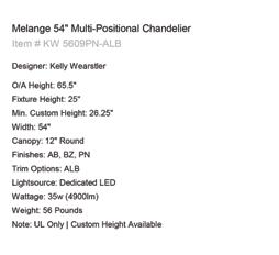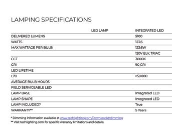 Next, you’ll want to pay attention to the Lamping Specifications as noted by the arrows in the specifications above. Because you can’t change out the lightbulb, you have to be sure the delivered amount of light and color are what you’re looking for. In this example, the Chandelier has 5100 delivered lumens or brightness, perfect for a large room around 25’L x 15’W or 375 sqft. The Kelvin rating is 3000. You should look for 2700-3000K for a typical home. If you live in a modern residence with clean lines and all white walls, you may want to experiment with a cooler temperature, as high as 5000K before investing in a more permanent fixture.