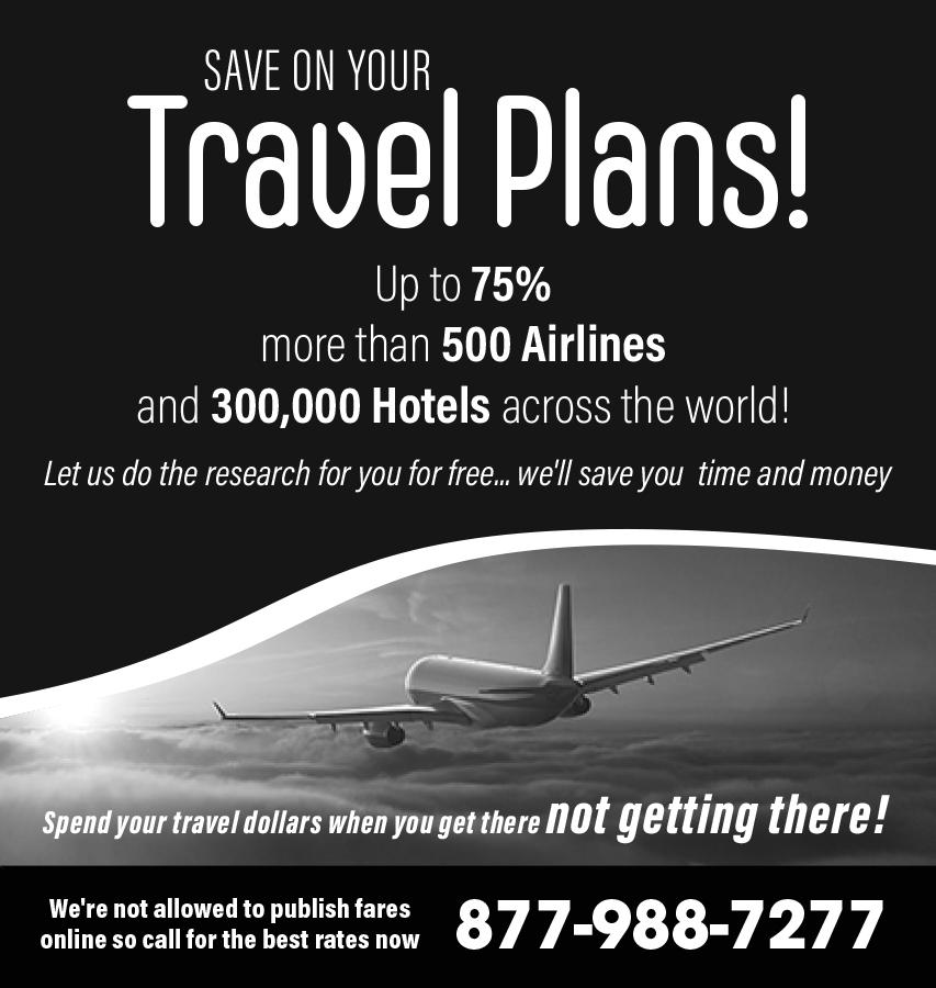SAVE ON YOUR TRAVEL PLANS! Up to 75% More than 500 AIRLINES and 300,000 HOTELS across the world. Let us do the research for you for FREE! Call: 877 988 7277